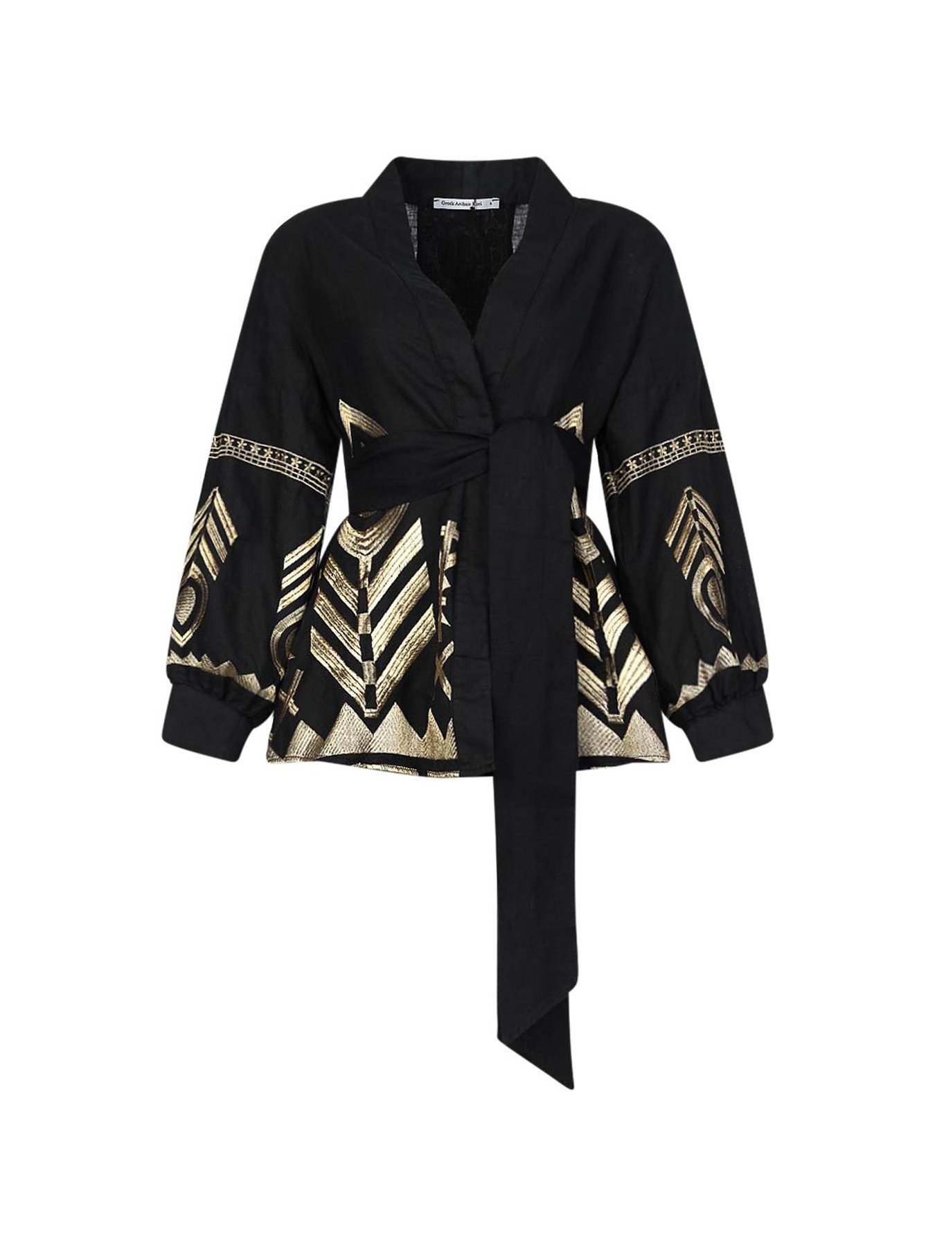 Greek Archaic Kori Embroidered Long Sleeves Feather Shirt Kimono Top Black/Gold
