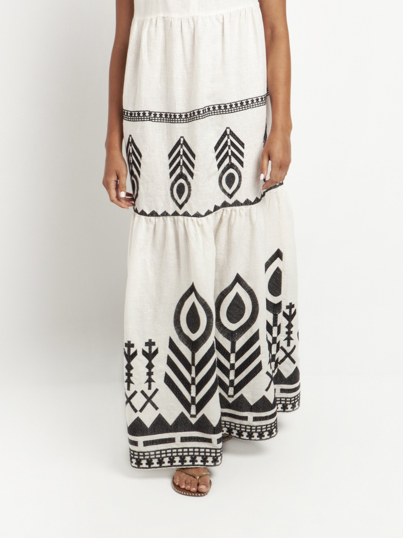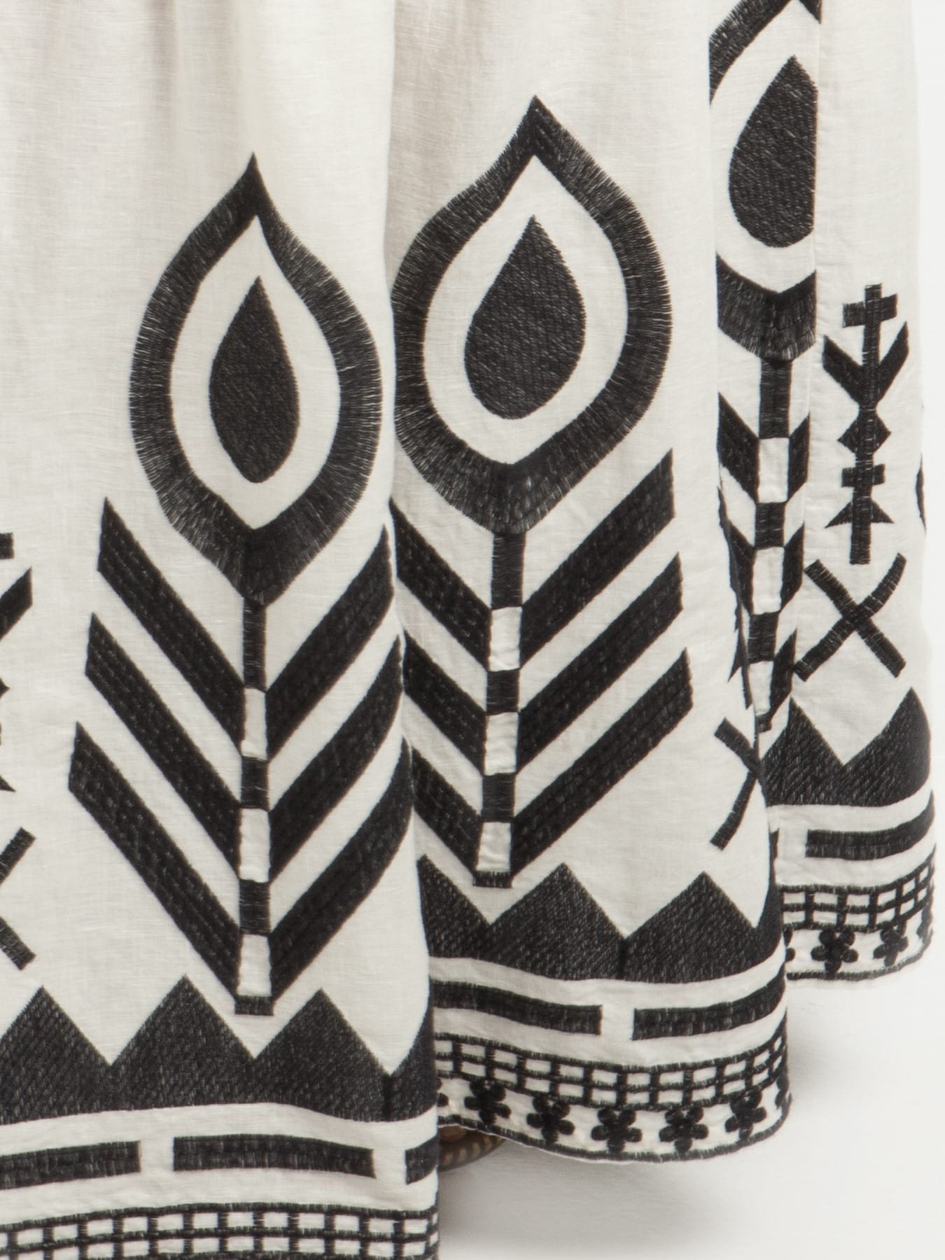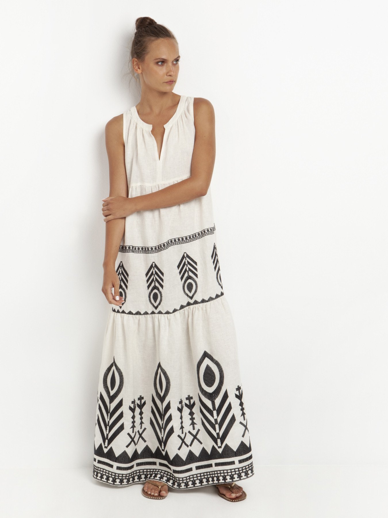 Greek Archaic Kori Embroidered Sleeveless Feather Dress Natural/Black