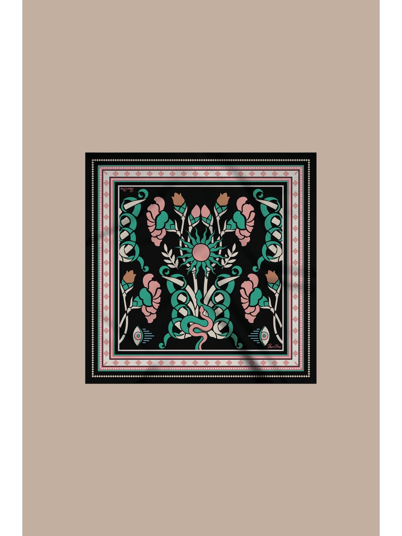 The Moonflower Scarf combines floral designs in shades of pink and green,