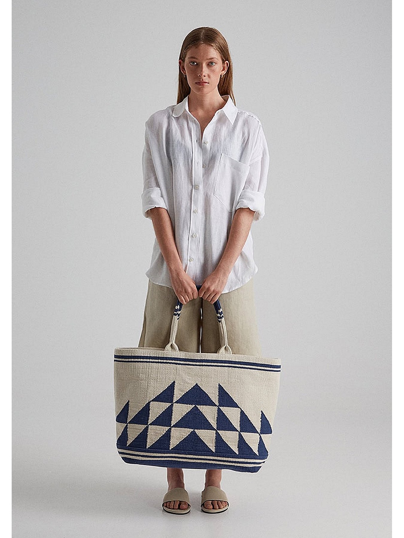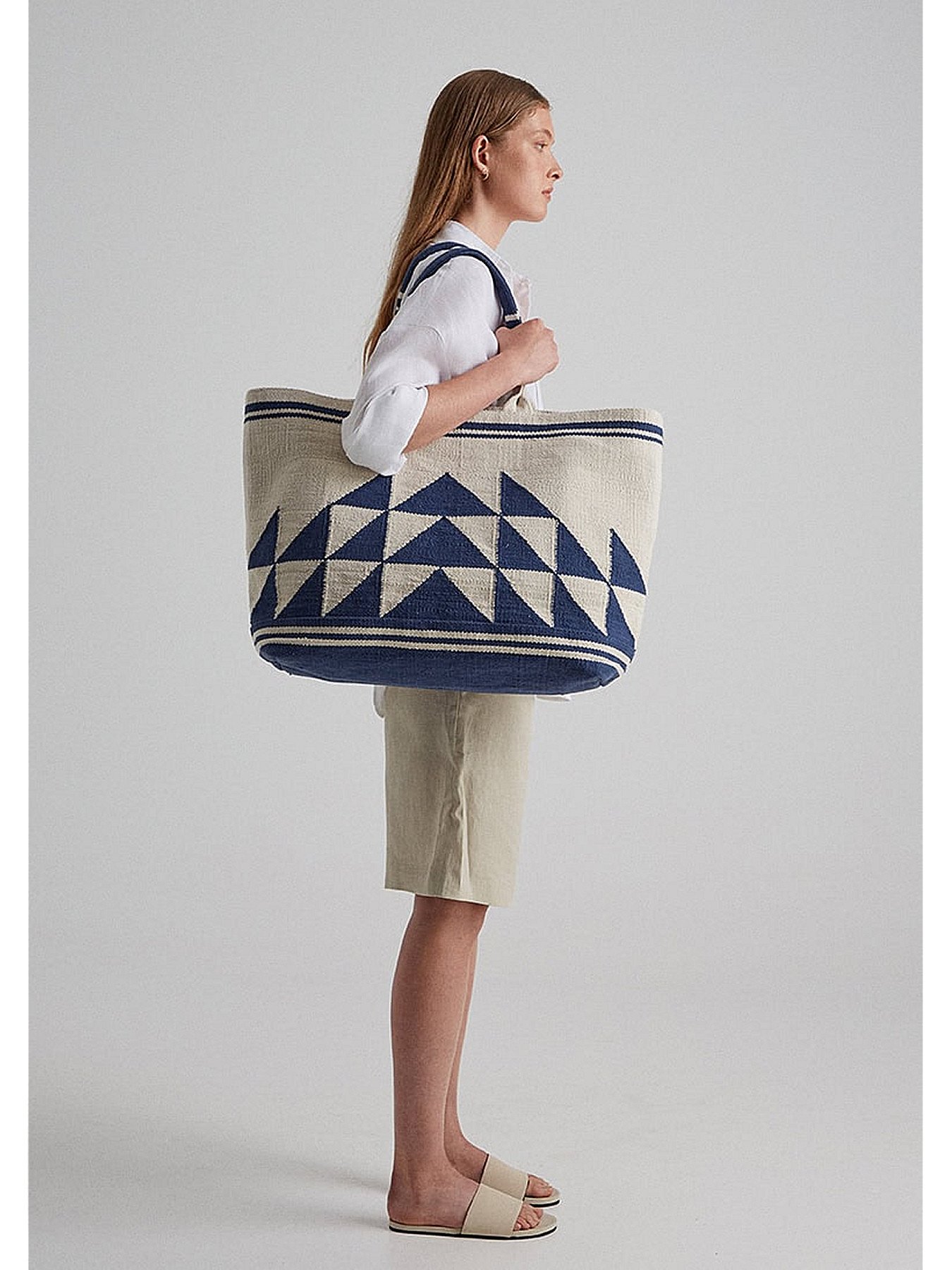Our Beausoleil oversized tote, meticulously handcrafted from durable cotton, features an exclusive triangle motif. With a spacious interior, magnetic clasp, zipper-locked inner pocket, and large handles, it effortlessly combines style and functionality for your summer adventures.