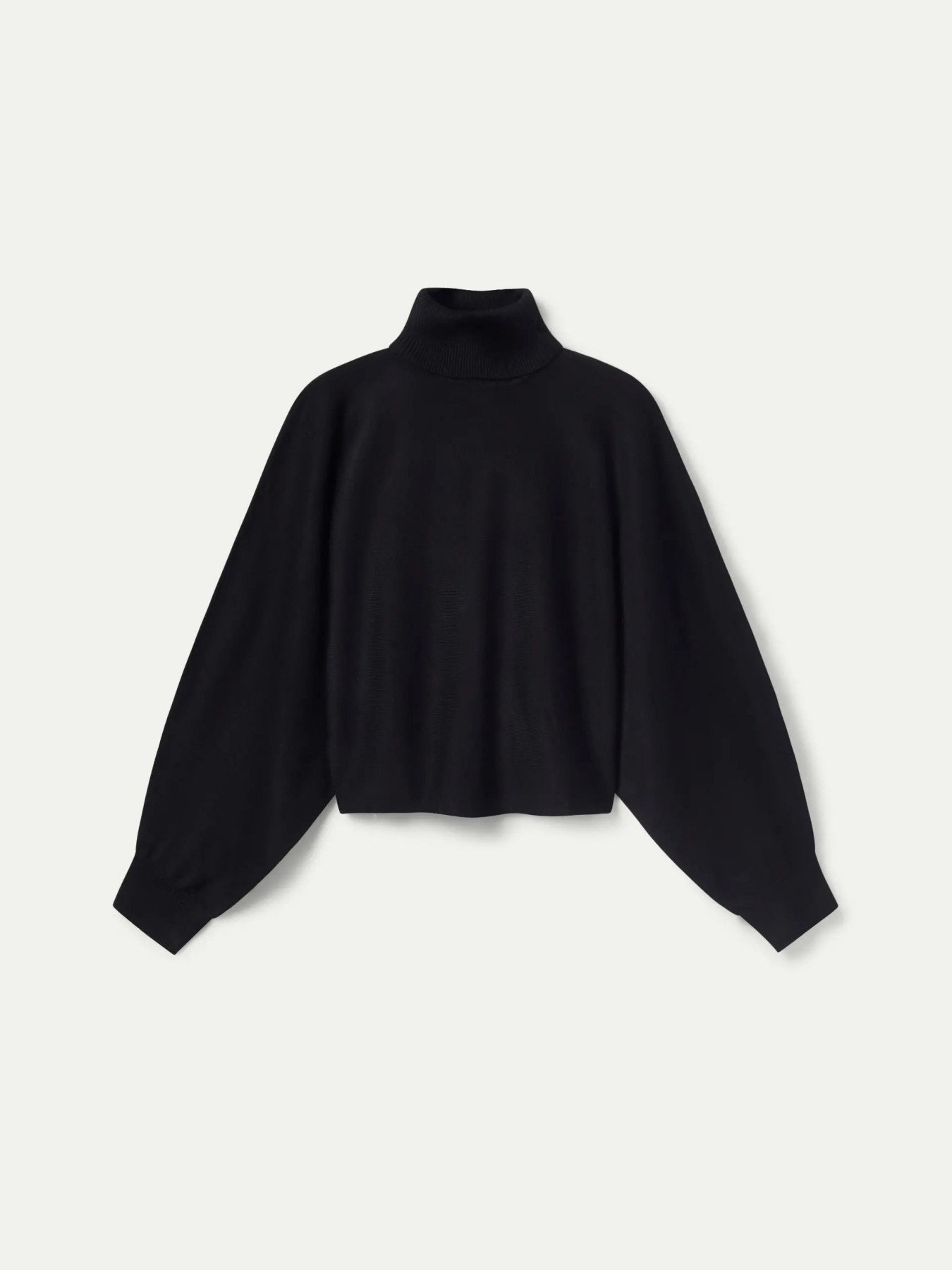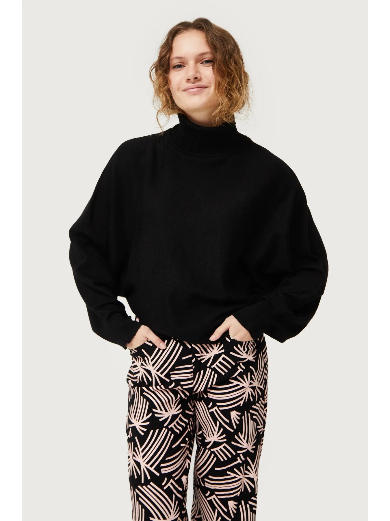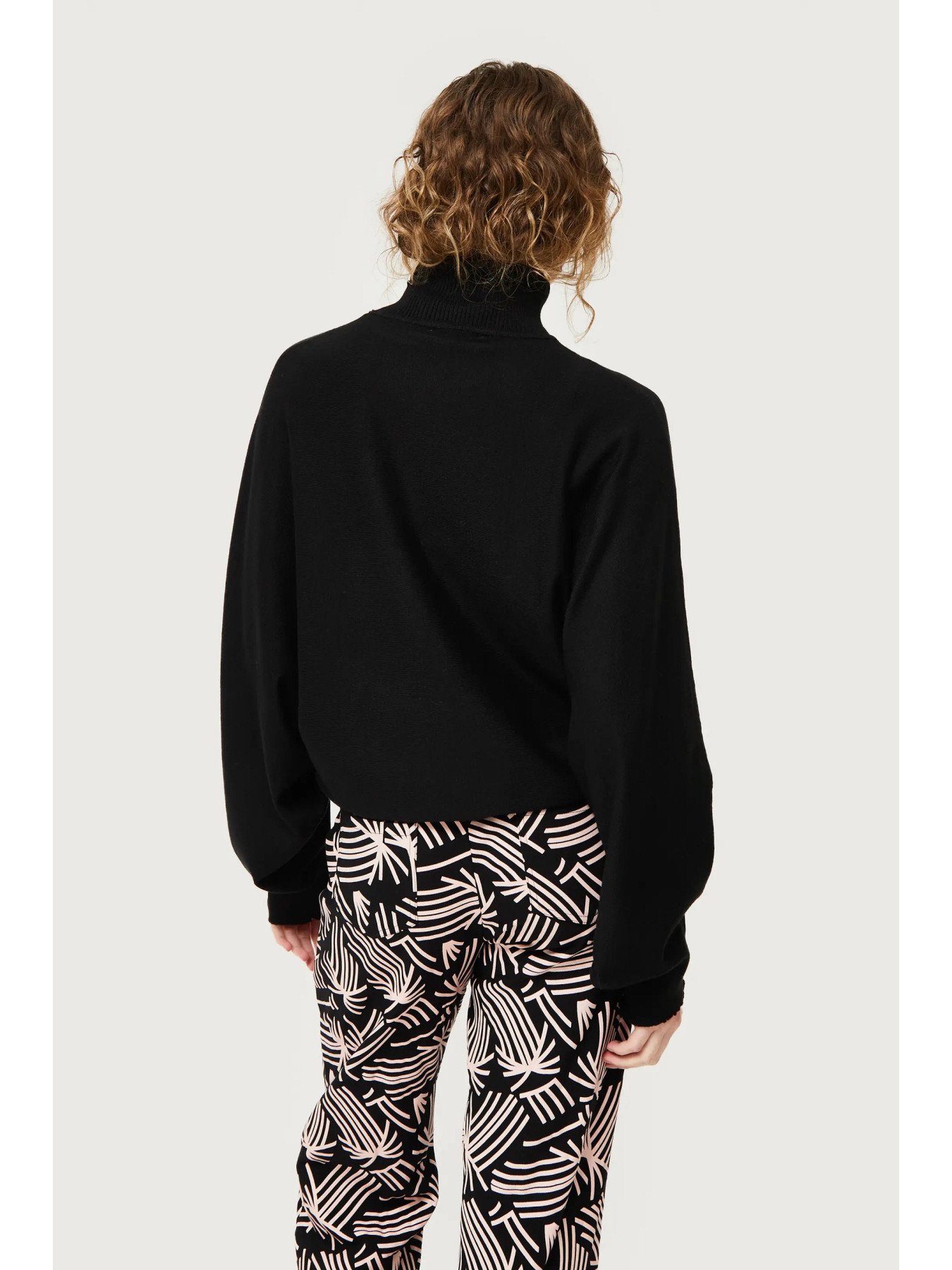 Μαύρο πλεκτό πουλόβερ. Με γιακά που ανοίγει και μακριά μανίκια με πεσμένους ώμους. Λεπτομέρεια μανσέτας. Το μοντέλο έχει ύψος 176 cm και φοράει νούμερο S.