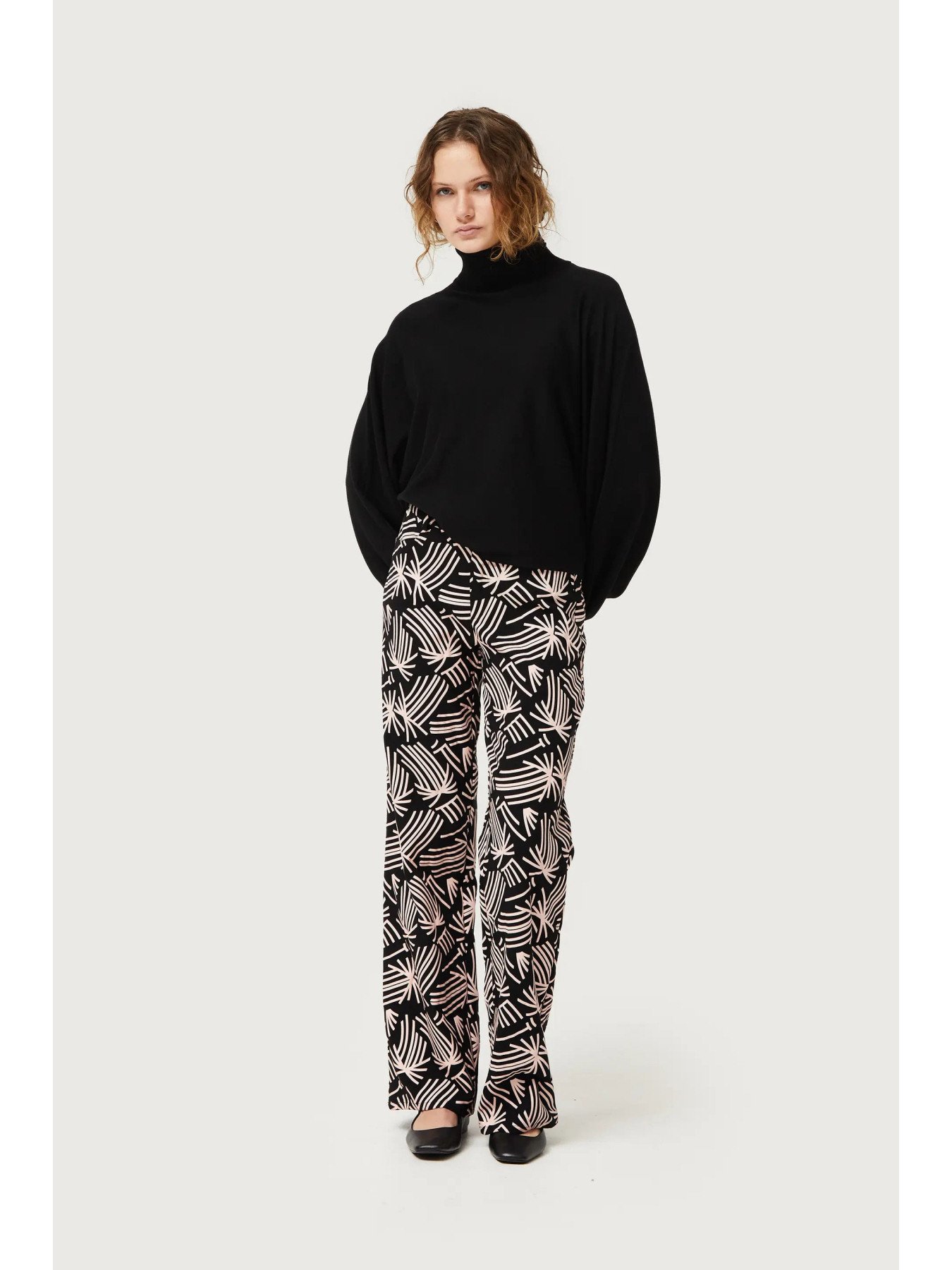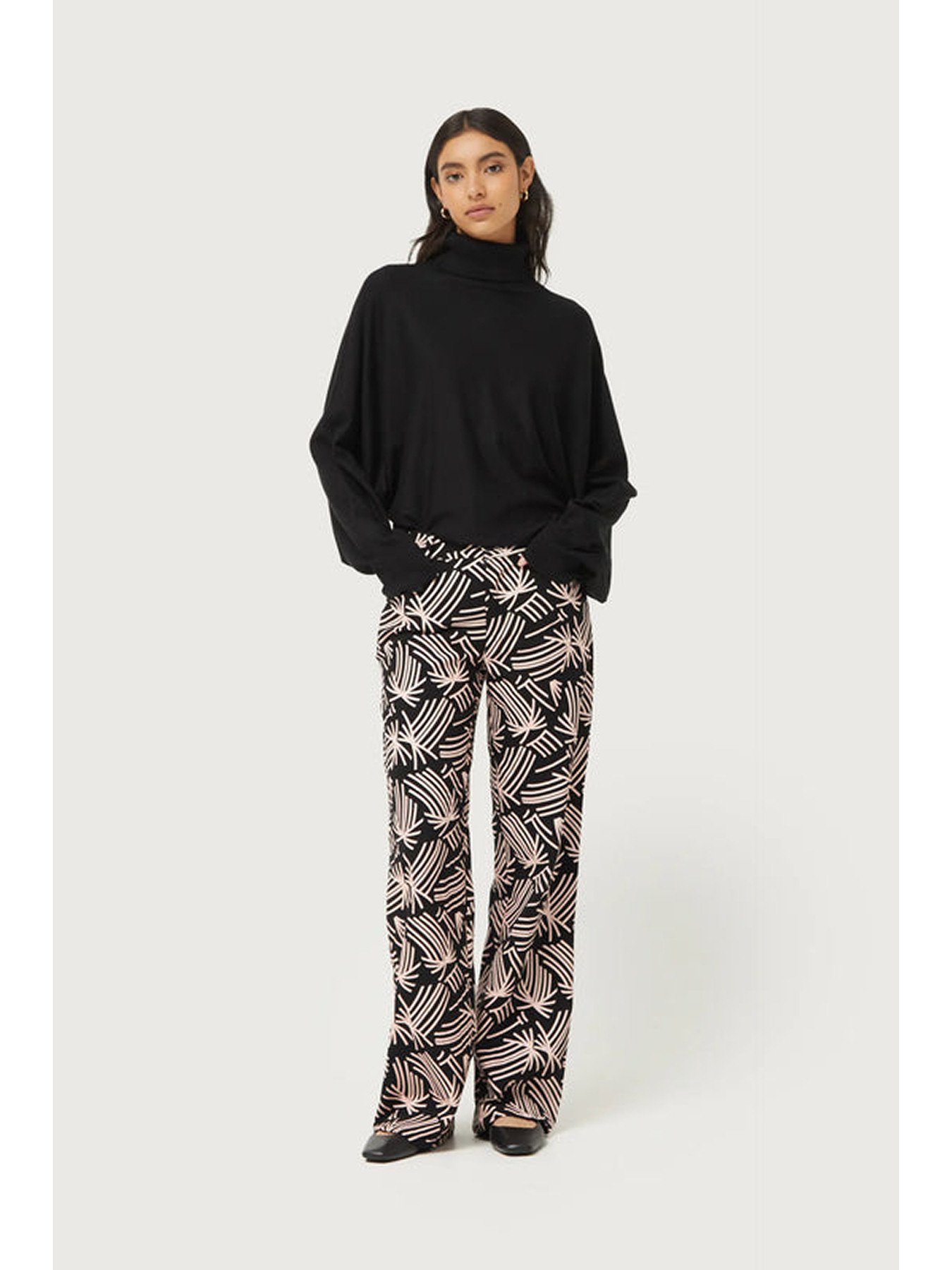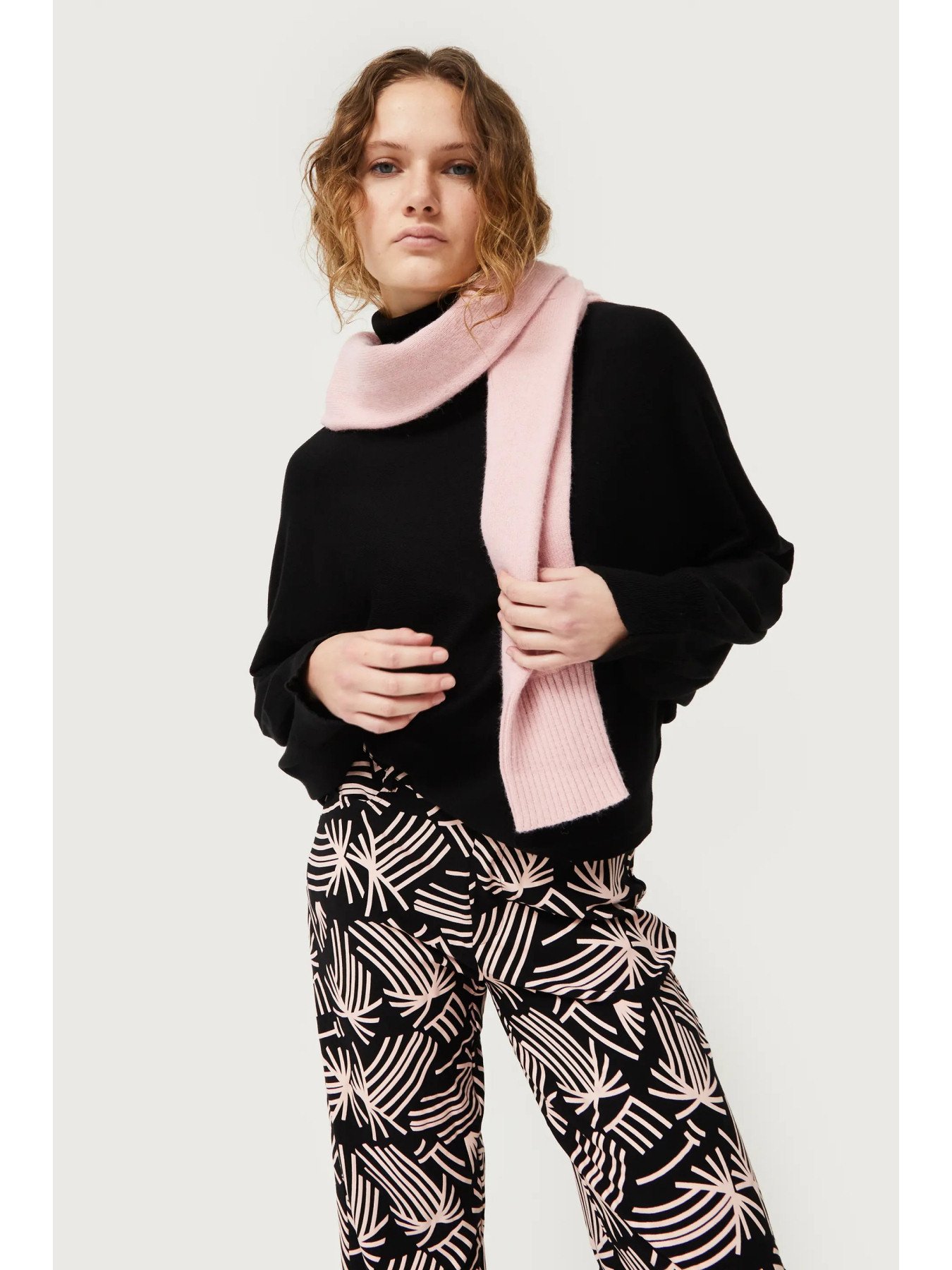 Μαύρο πλεκτό πουλόβερ. Με γιακά που ανοίγει και μακριά μανίκια με πεσμένους ώμους. Λεπτομέρεια μανσέτας. Το μοντέλο έχει ύψος 176 cm και φοράει νούμερο S.