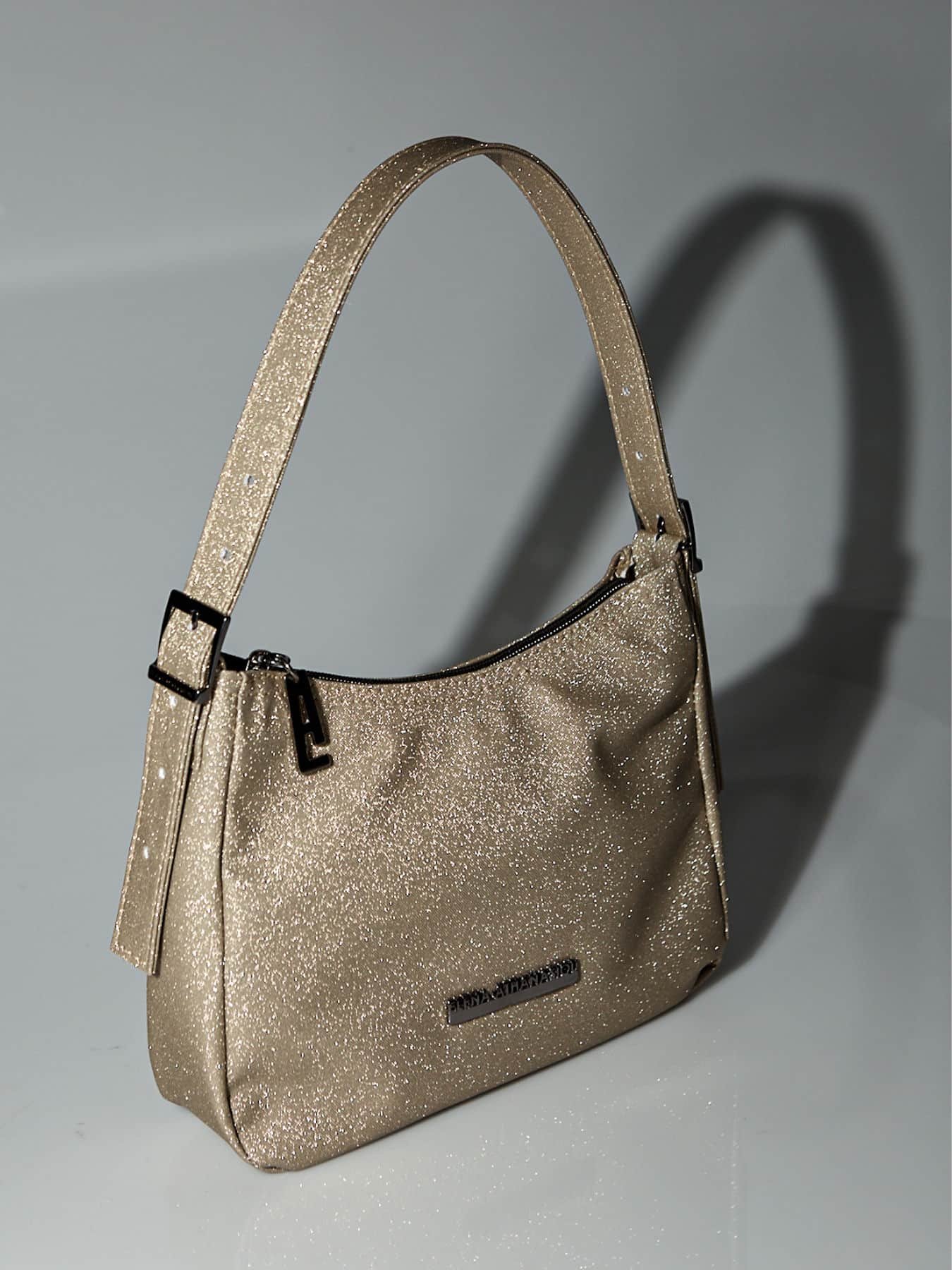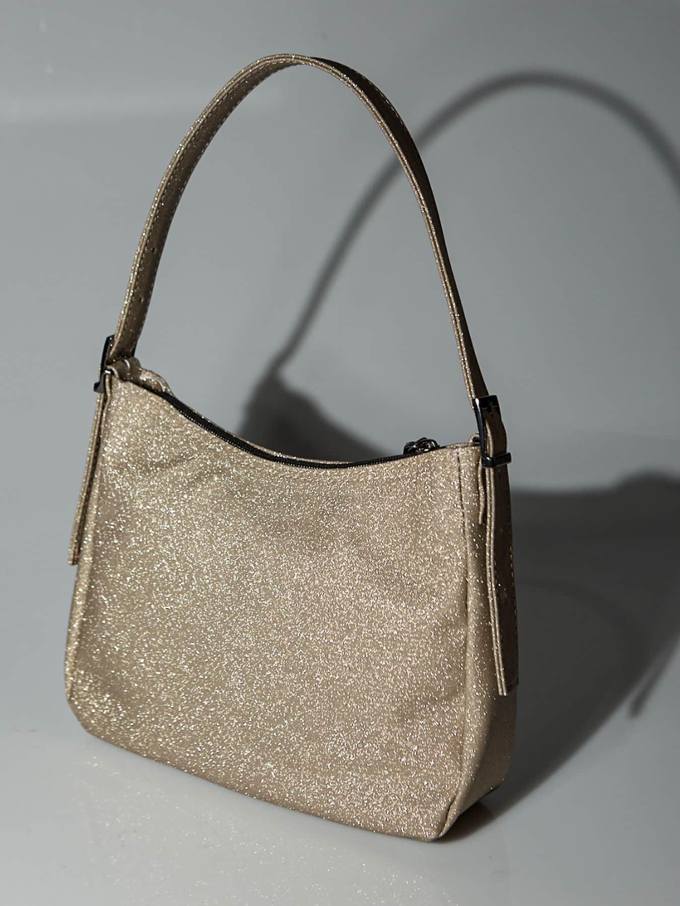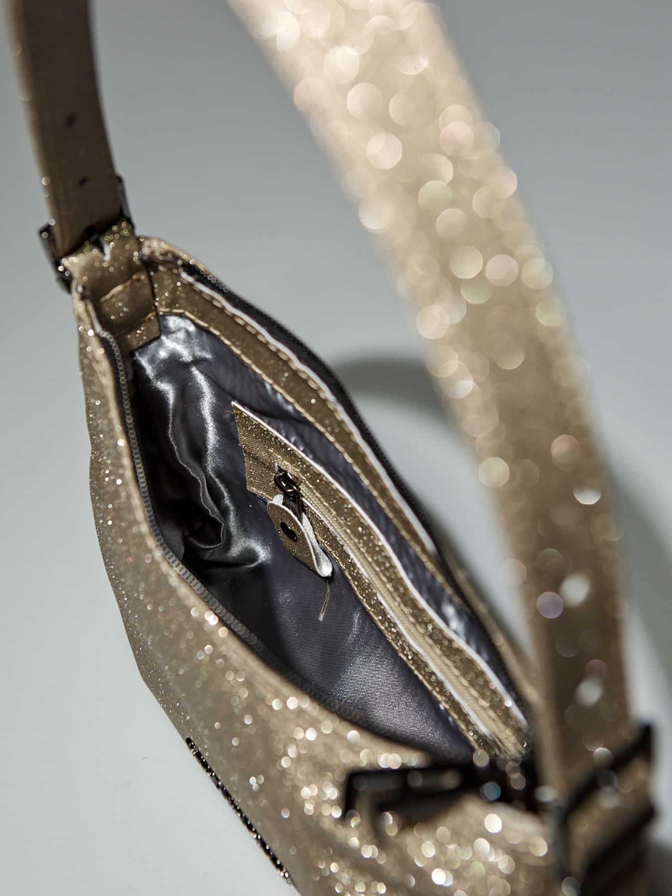 Disco Vintage Baguette Platinum. Closes with a zipper. It has an adjustable strap and gray satin lining.
