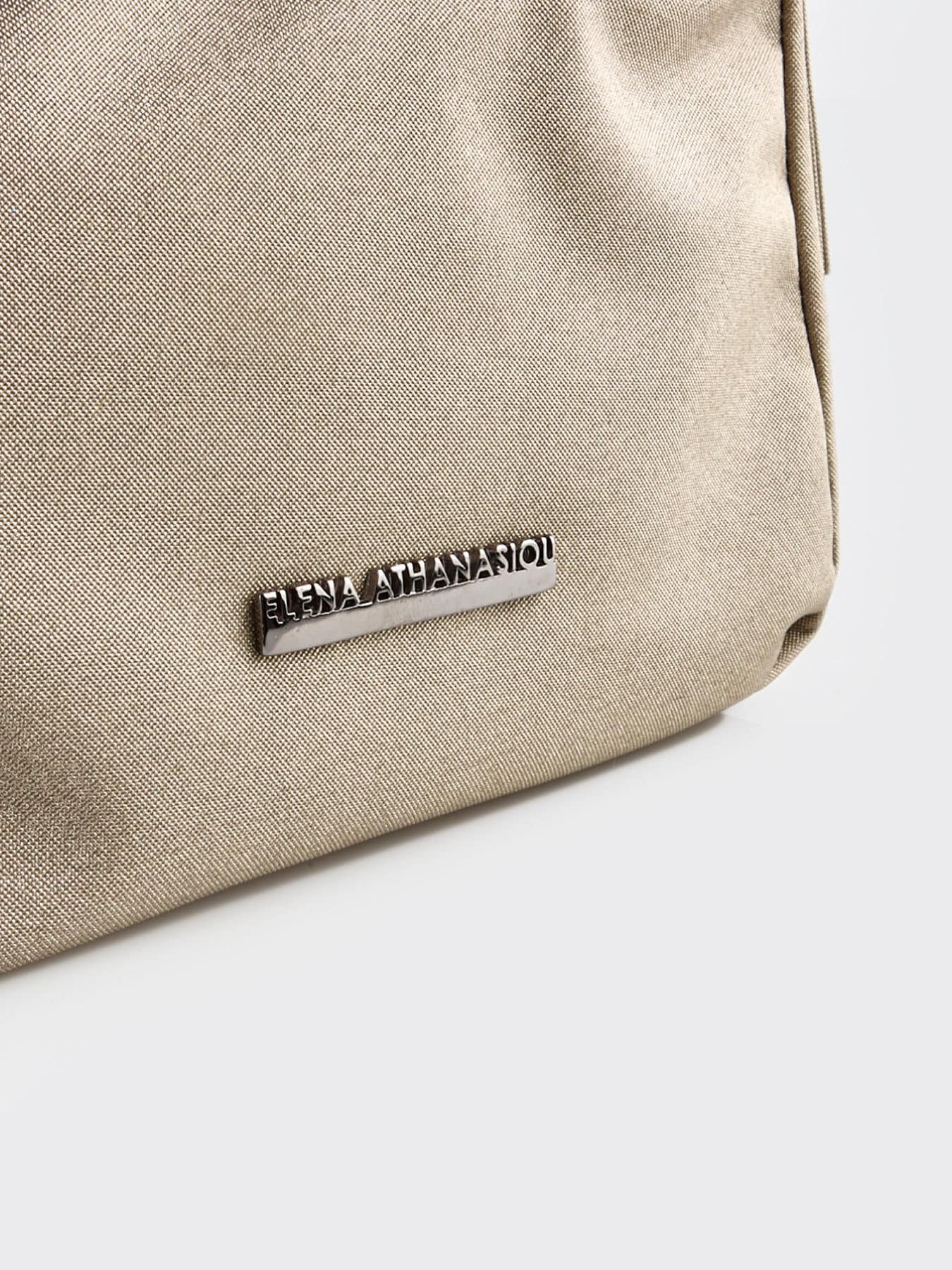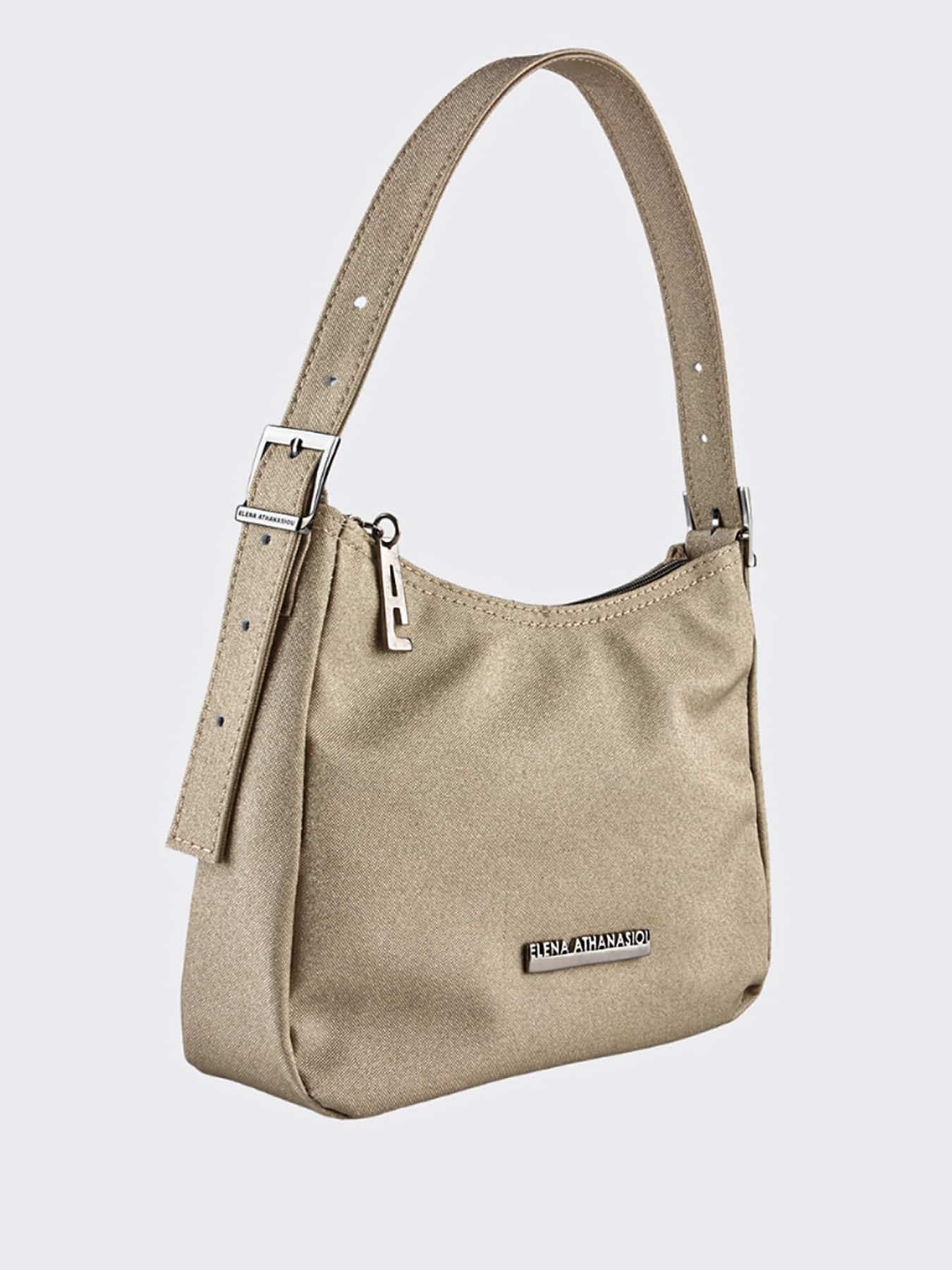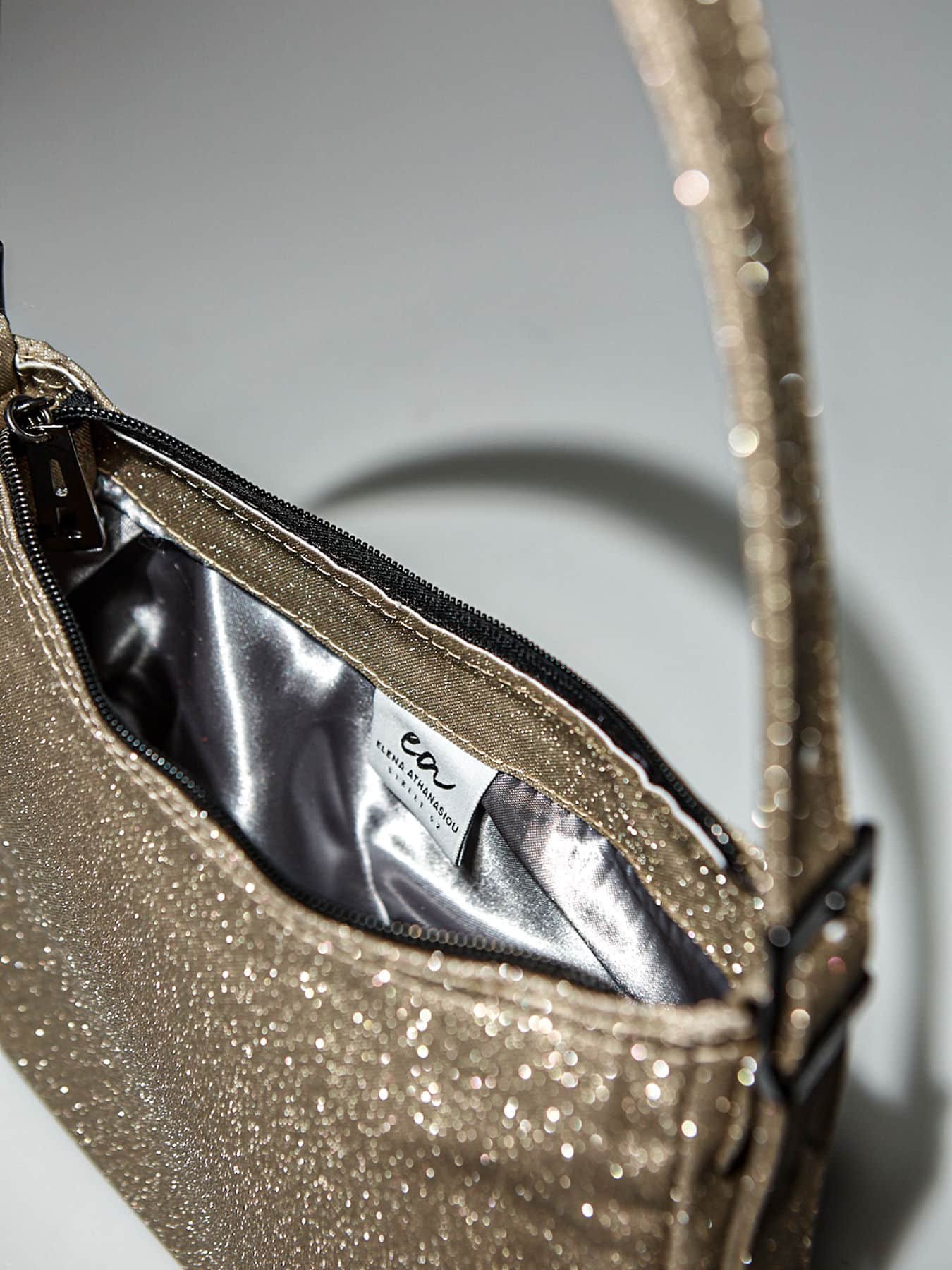 Disco Vintage Baguette Platinum. Closes with a zipper. It has an adjustable strap and gray satin lining.