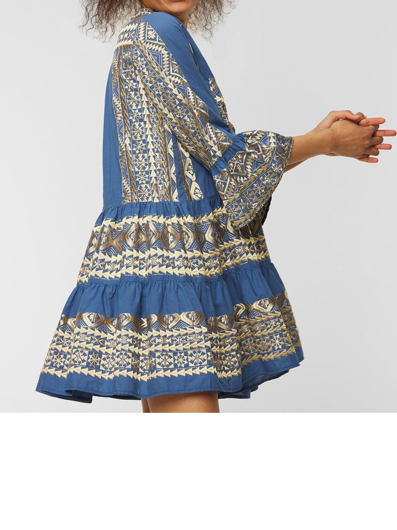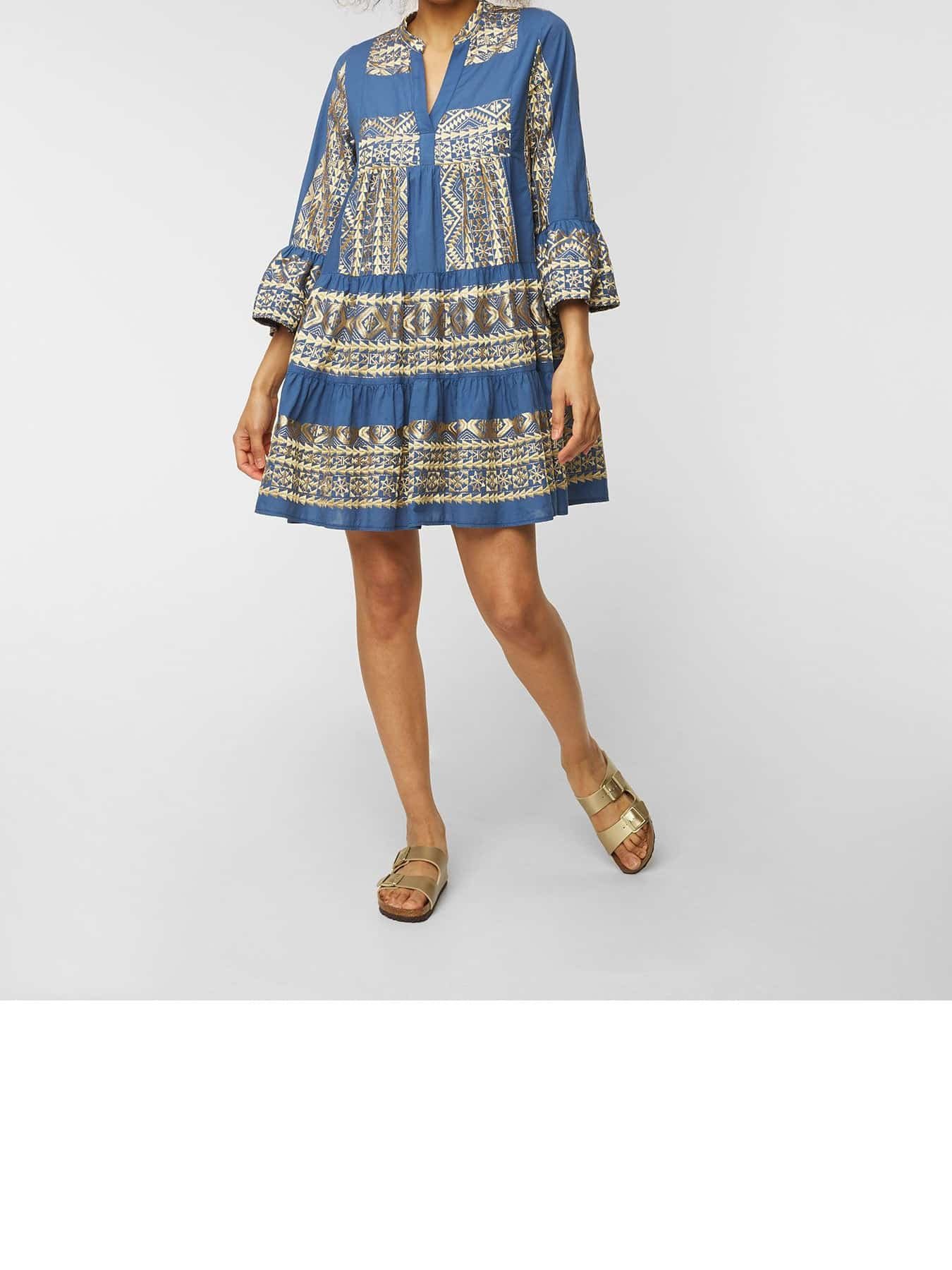 Greek Archaic Kori Embroidered Boho Mini Dress Indigo/Gold