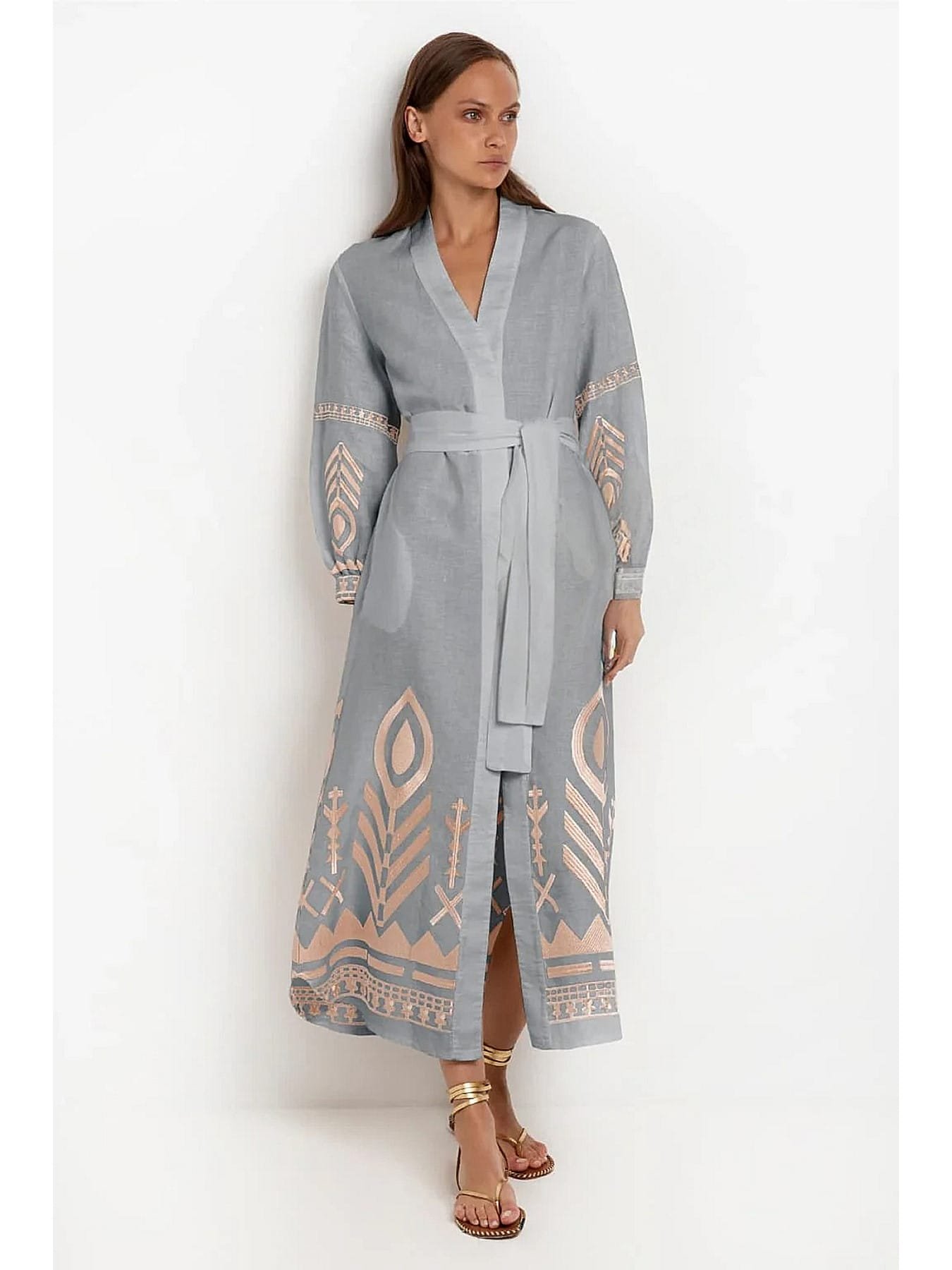 Greek Archaic Kori Embroidered Feather Maxi Chemisier Kimono Dress Linen Light Grey/Pink Bronze