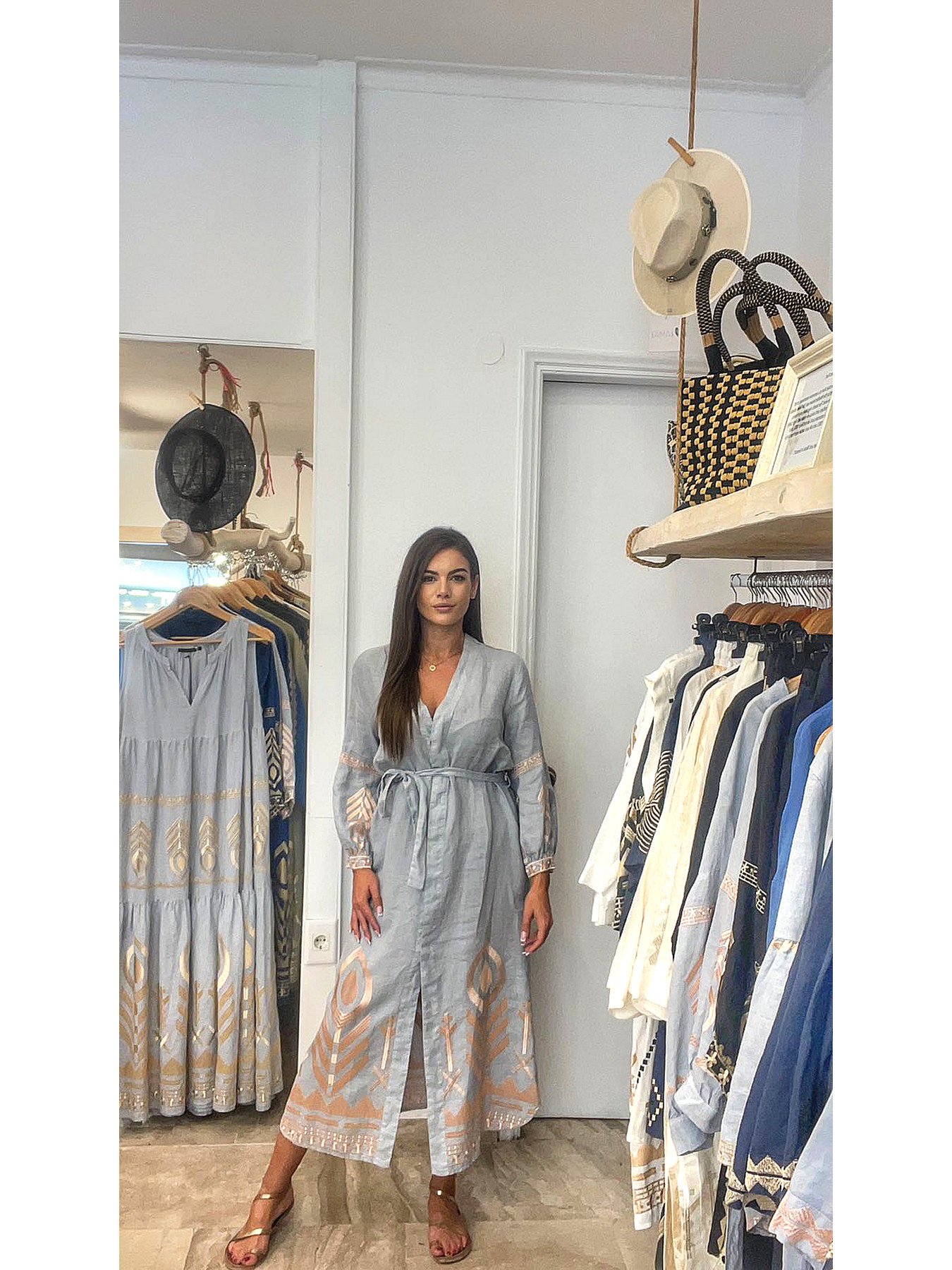An easy linen summer kimono – dress with long sleeves, V neck and embroideries Sienne, Your best friend for the hot days of summer