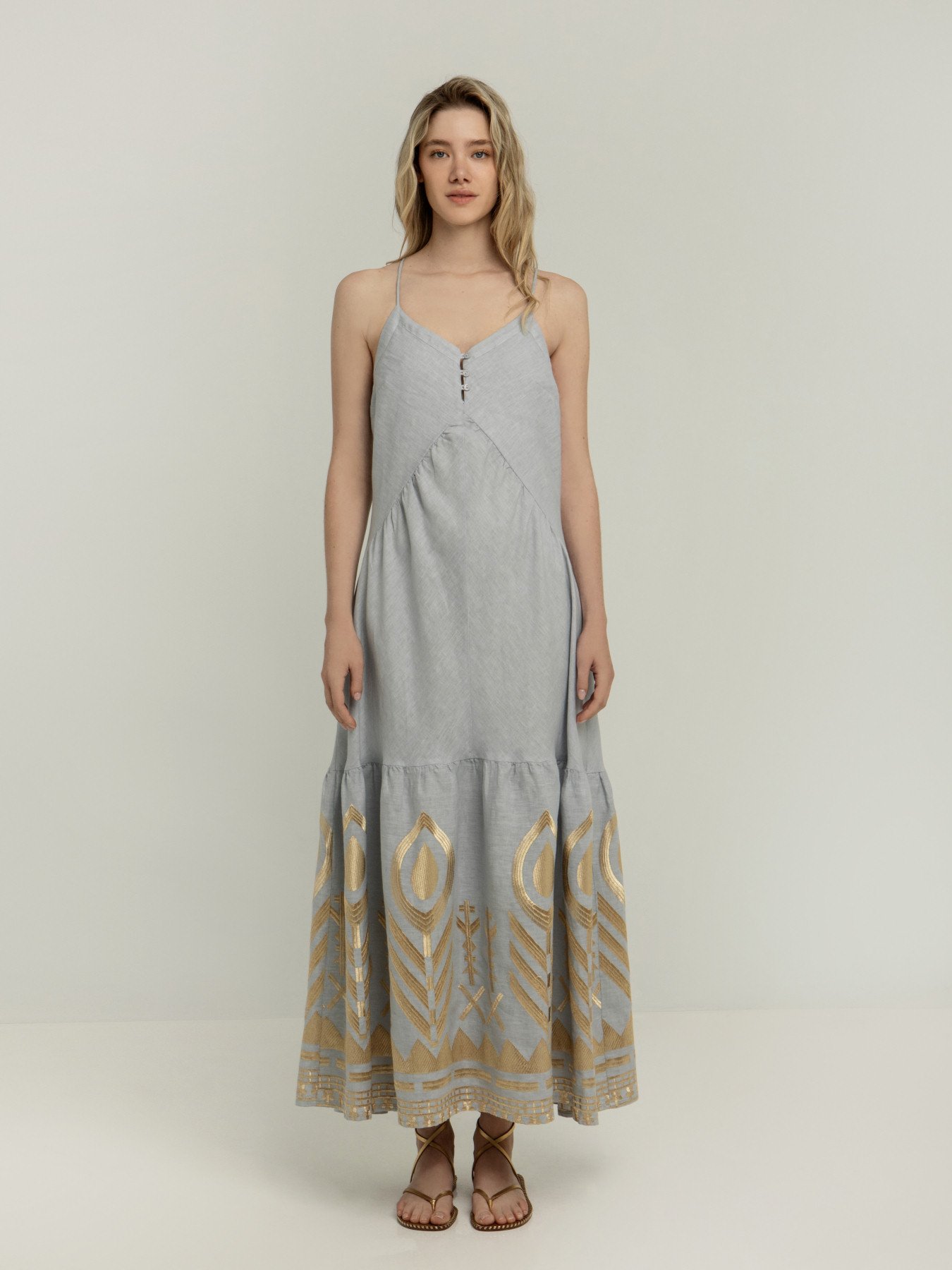 Greek Archaic Kori Feather Λινό Μάξι Φόρεμα Τιραντάκια Γκρι/Χρυσό