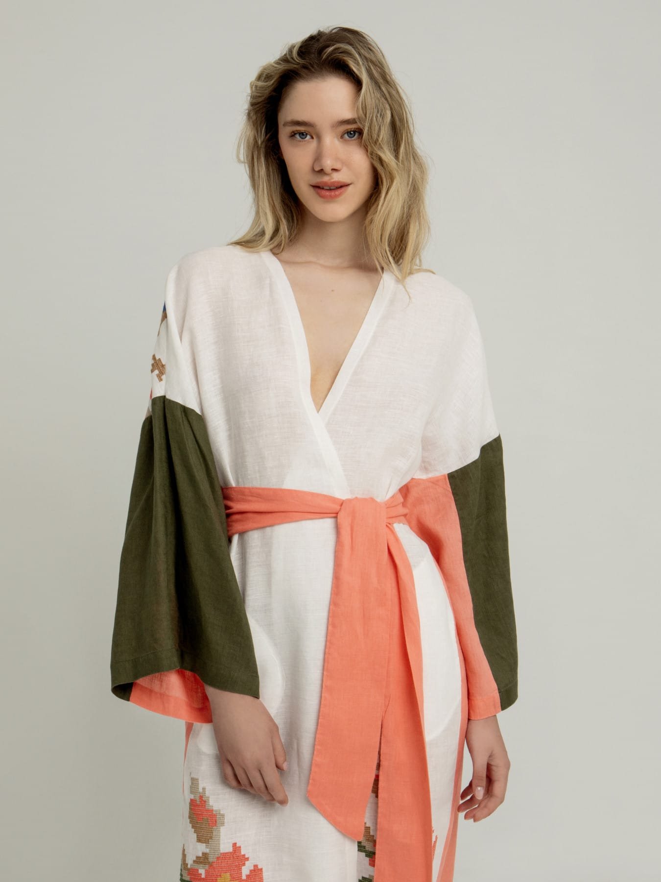 Greek Archaic Kori Embroidered Floral Print Belted Κιμονό Λευκό/Χακι