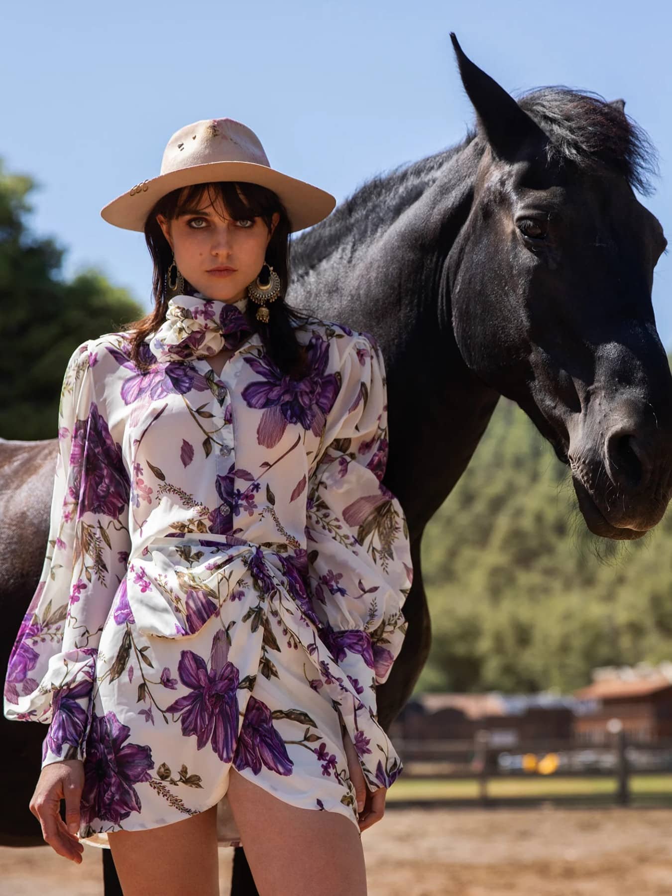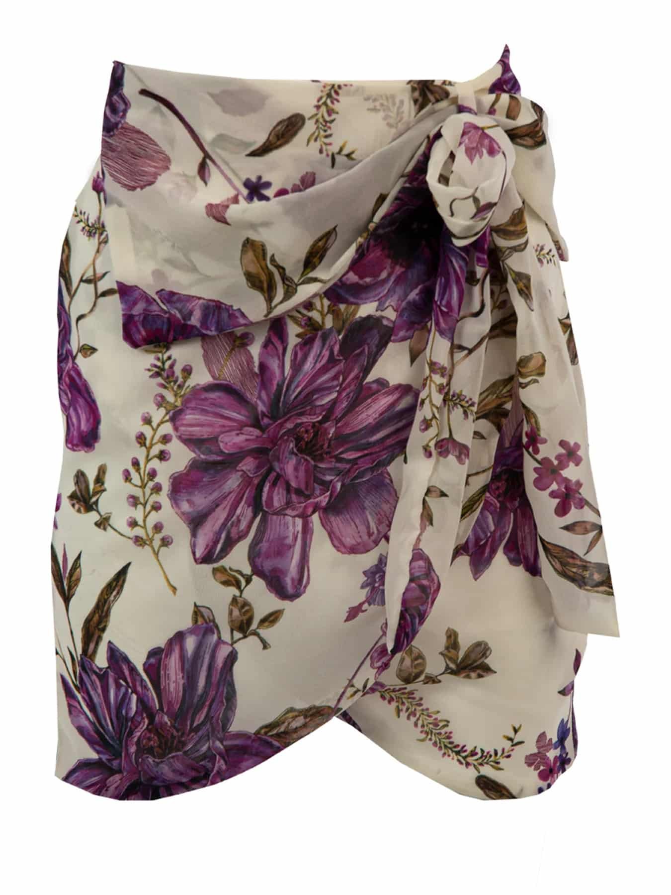 Joanna’s white canvas is painted with a garden of purple flowers. Wrap effect skirt combined with Joanna Shirt is your key to a graceful and comfortable outfit for any occasion, day in and day out.