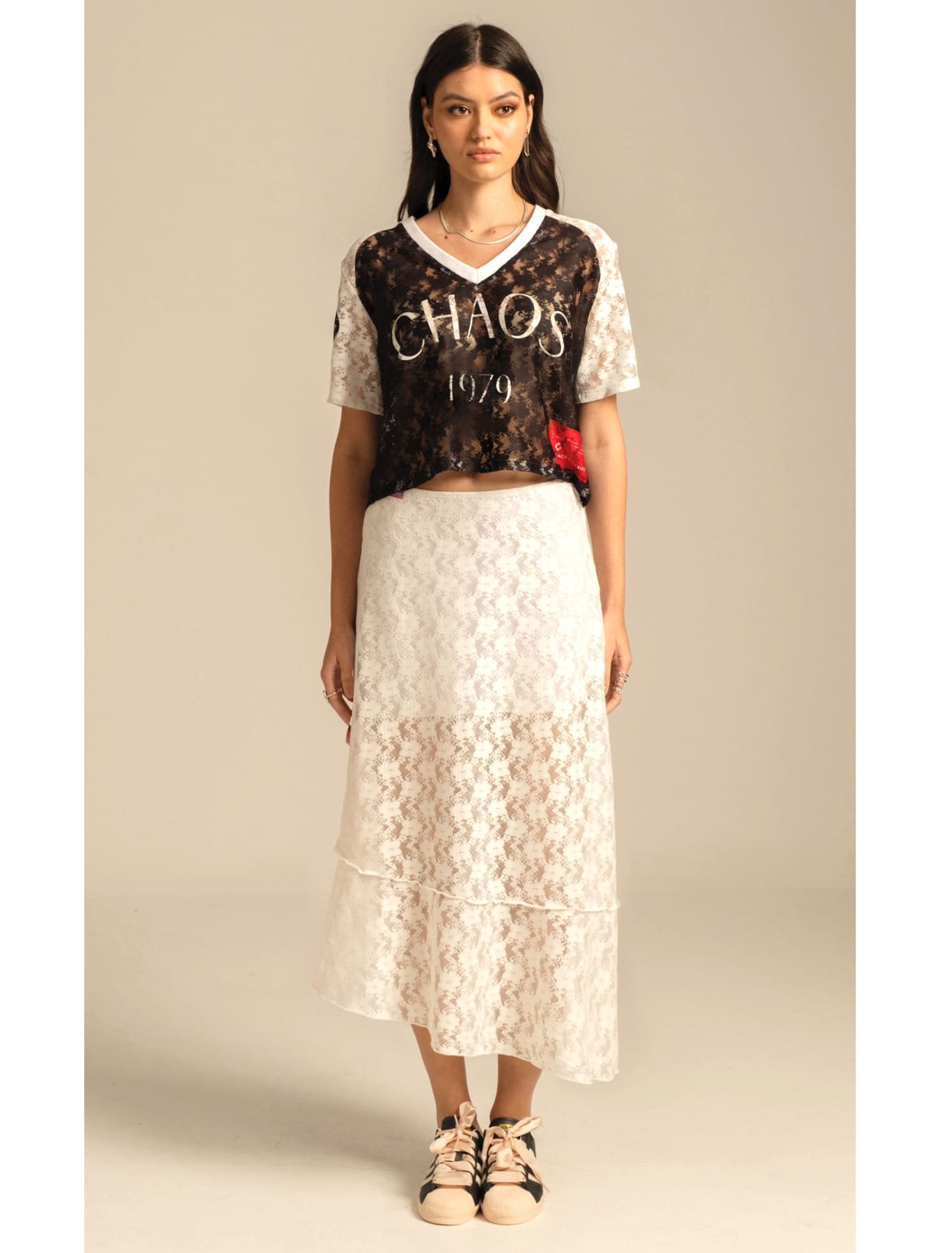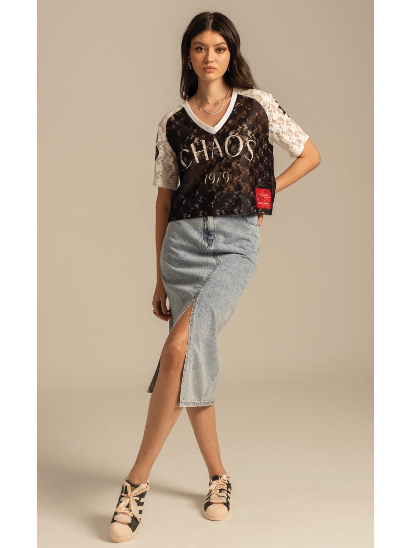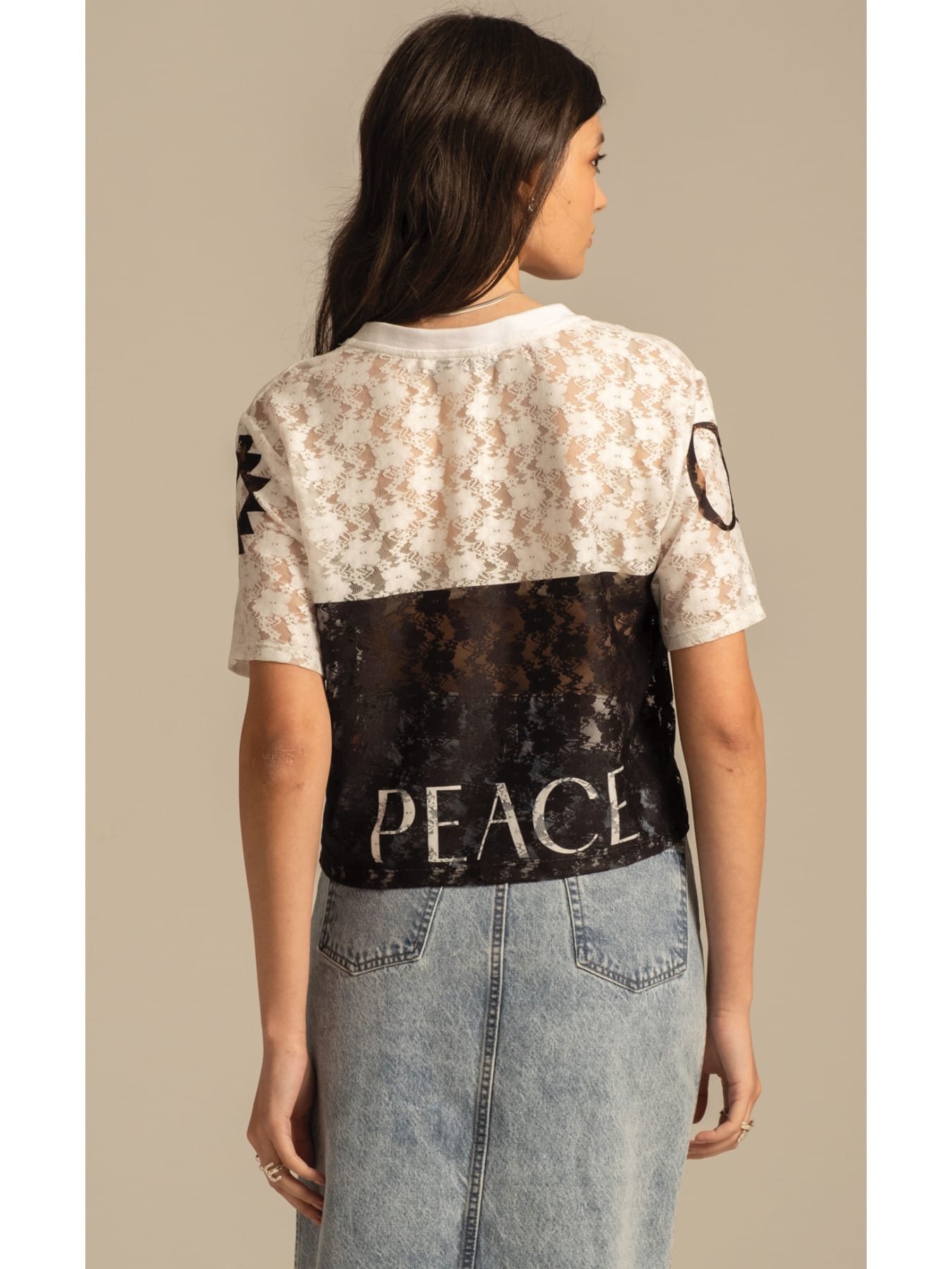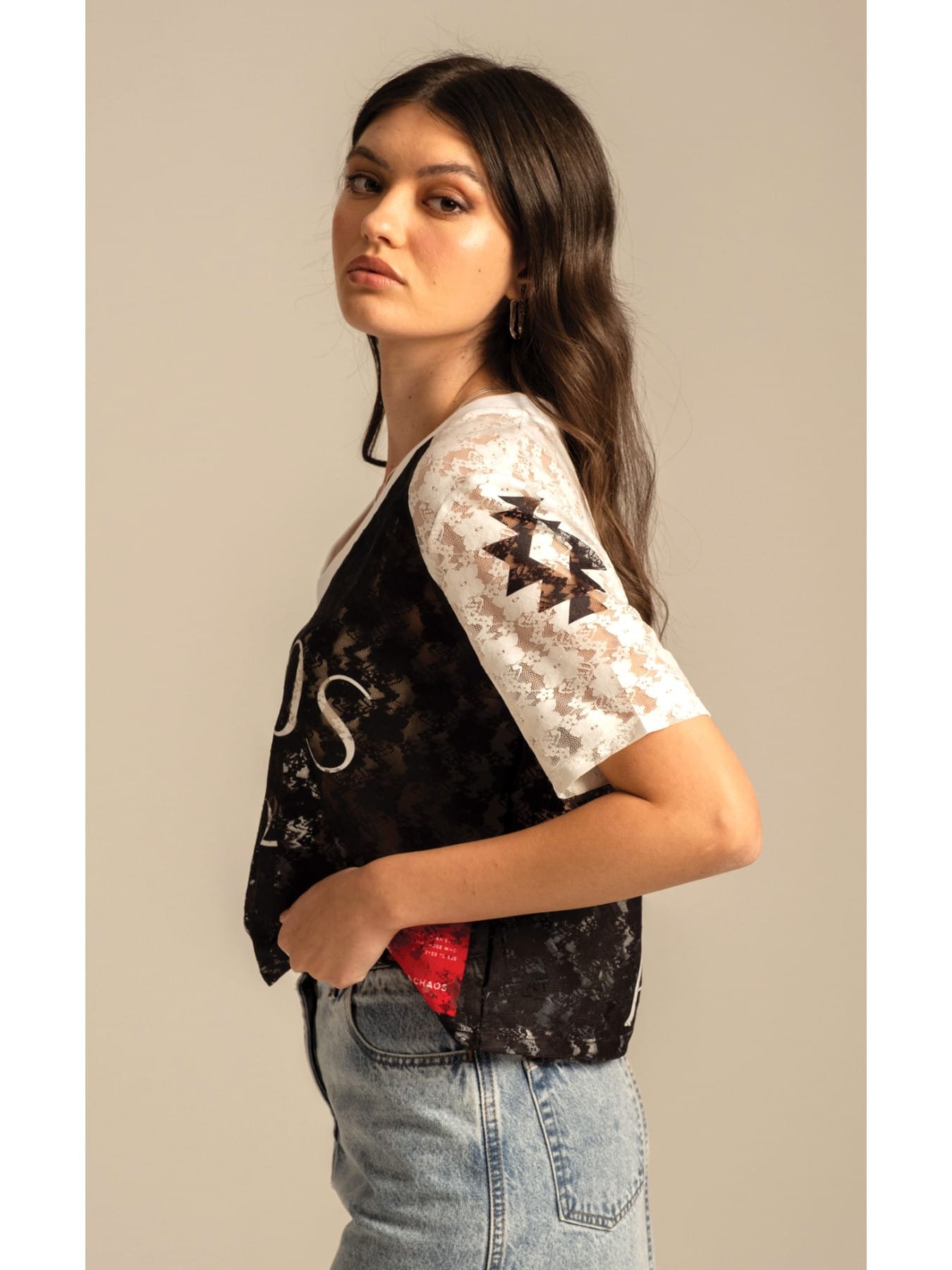 Αέρινη δαντέλα και δυναμικό στυλ συναντιούνται στο Cosmos Lace Crop Top. Οι αθλητικές λεπτομέρειες του placement print περιλαμβάνουν το λογότυπο Peace στην πλάτη, το Chaos μπροστά και το σύμβολο Chaka στο μανίκι. Αυτό το ελαστικό, διάφανο τοπ από δαντέλα σε μαύρο και λευκό χρώμα έχει boxy γραμμή, V λαιμόκοψη με ριμπ λεπτομέρεια και μια ιδιαίτερη κόκκινη υφαντή ετικέτα P+C. Φορέστε το μέσα από μια ψηλόμεση Karmic Denim Skirt σε μπλε χρώμα ή συνδυάστε το με τη Laceflower Maxi Skirt για μια πιο ρομαντική εμφάνιση.