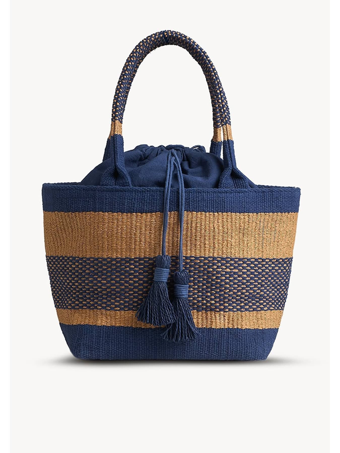 The San Remo Mini Tote Bag: Compact, handcrafted from durable cotton and paper raffia blend. Features a two-color stripe motif, spacious interior with a drawstring-closure pouch. Comfortable handles blend practicality with elegance.